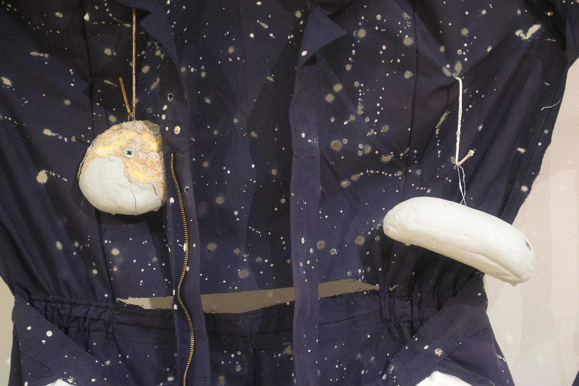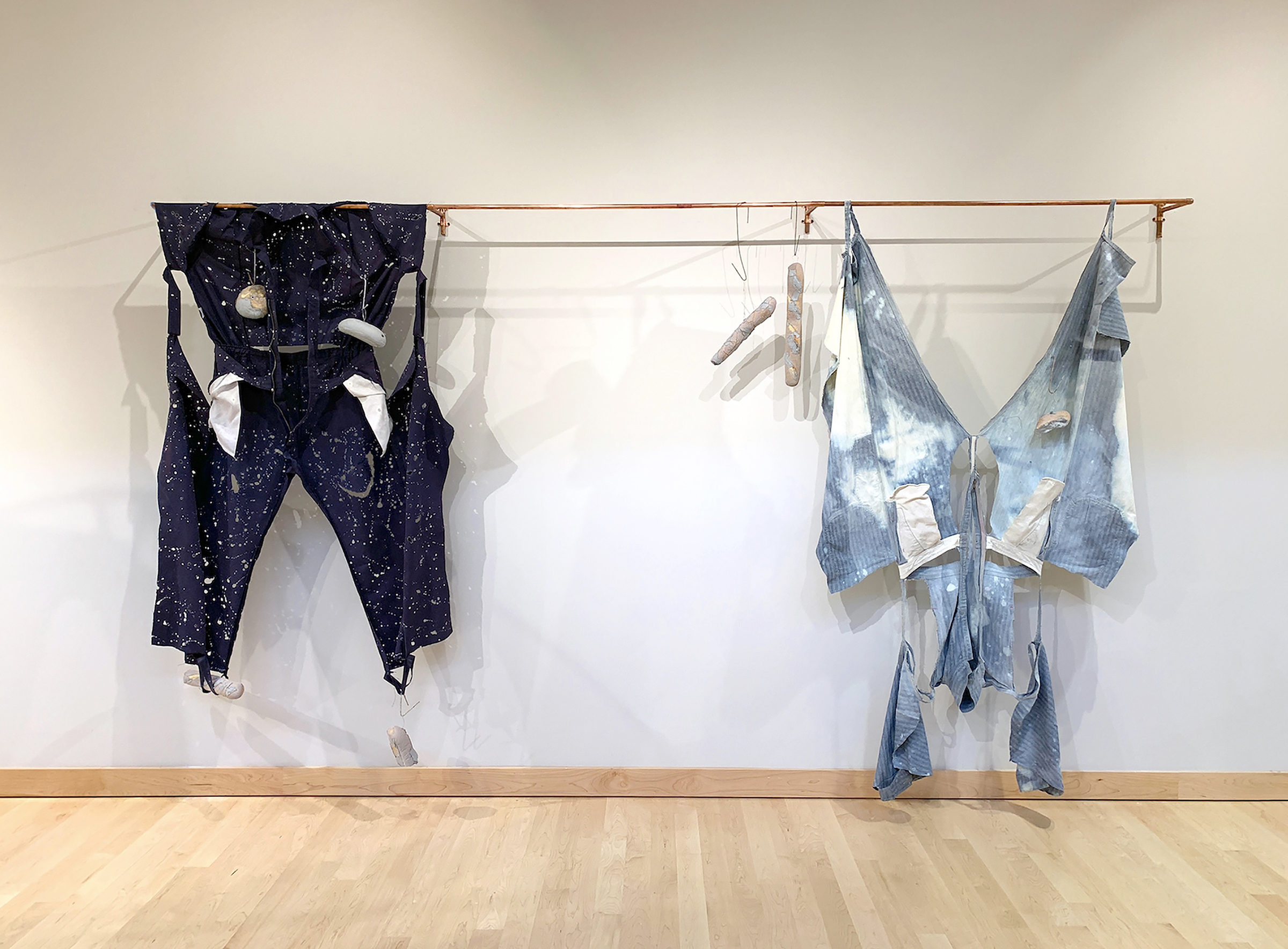 daily ceremony (left), drawn and quartered denim (right), dimensions variable, modified work wear, copper pipe, dessicated bread loaves, unfired clay, wire, hardware, 2019