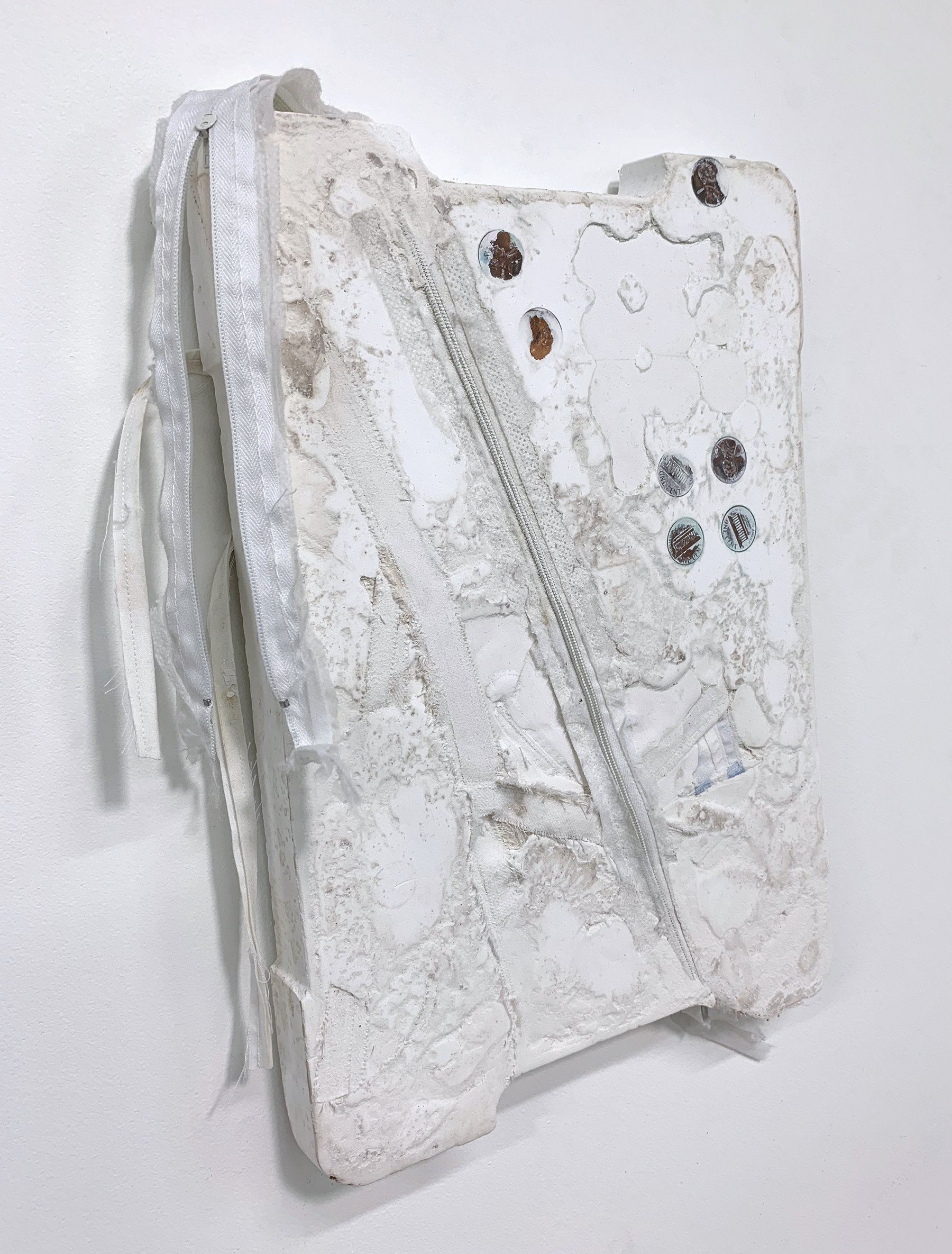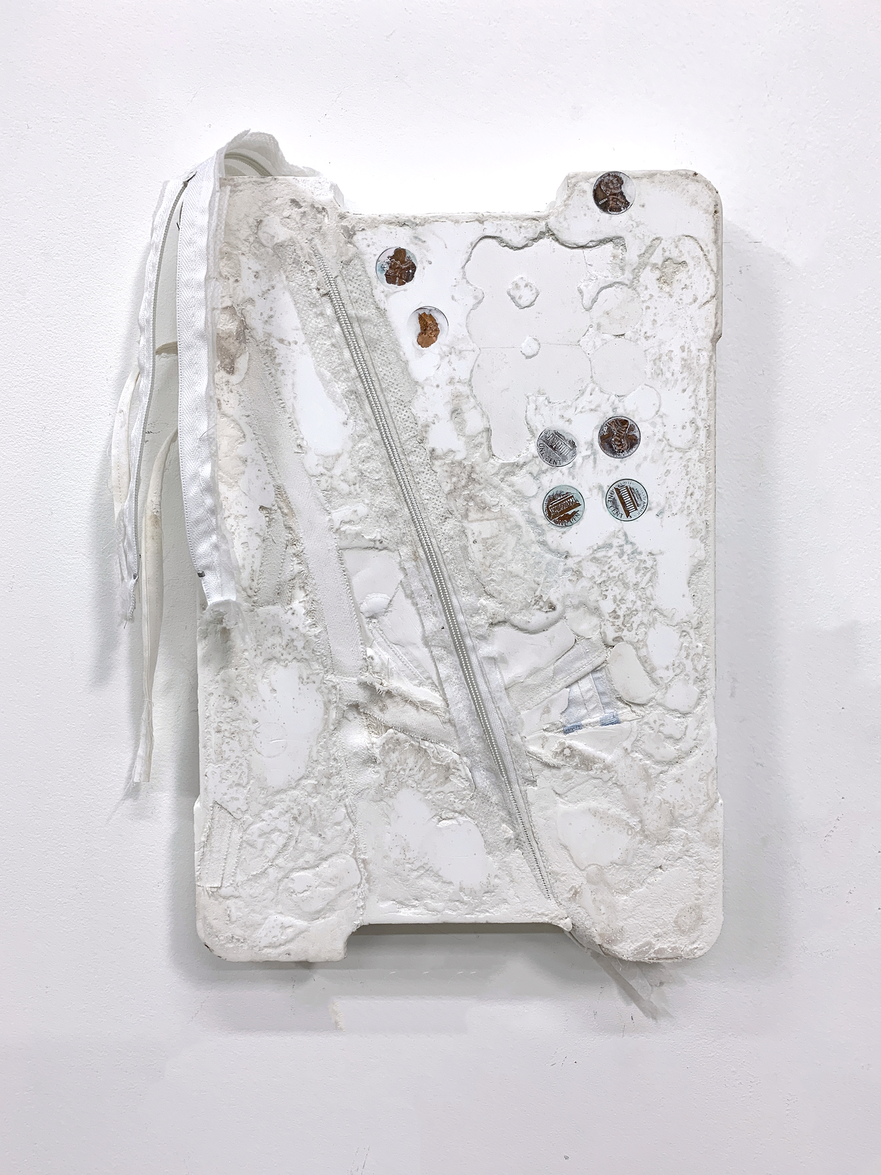 Time Tablets: white collar #4695, 2020, shirt fragments, Hydrocal, pigment, 18”x14”x1.5”