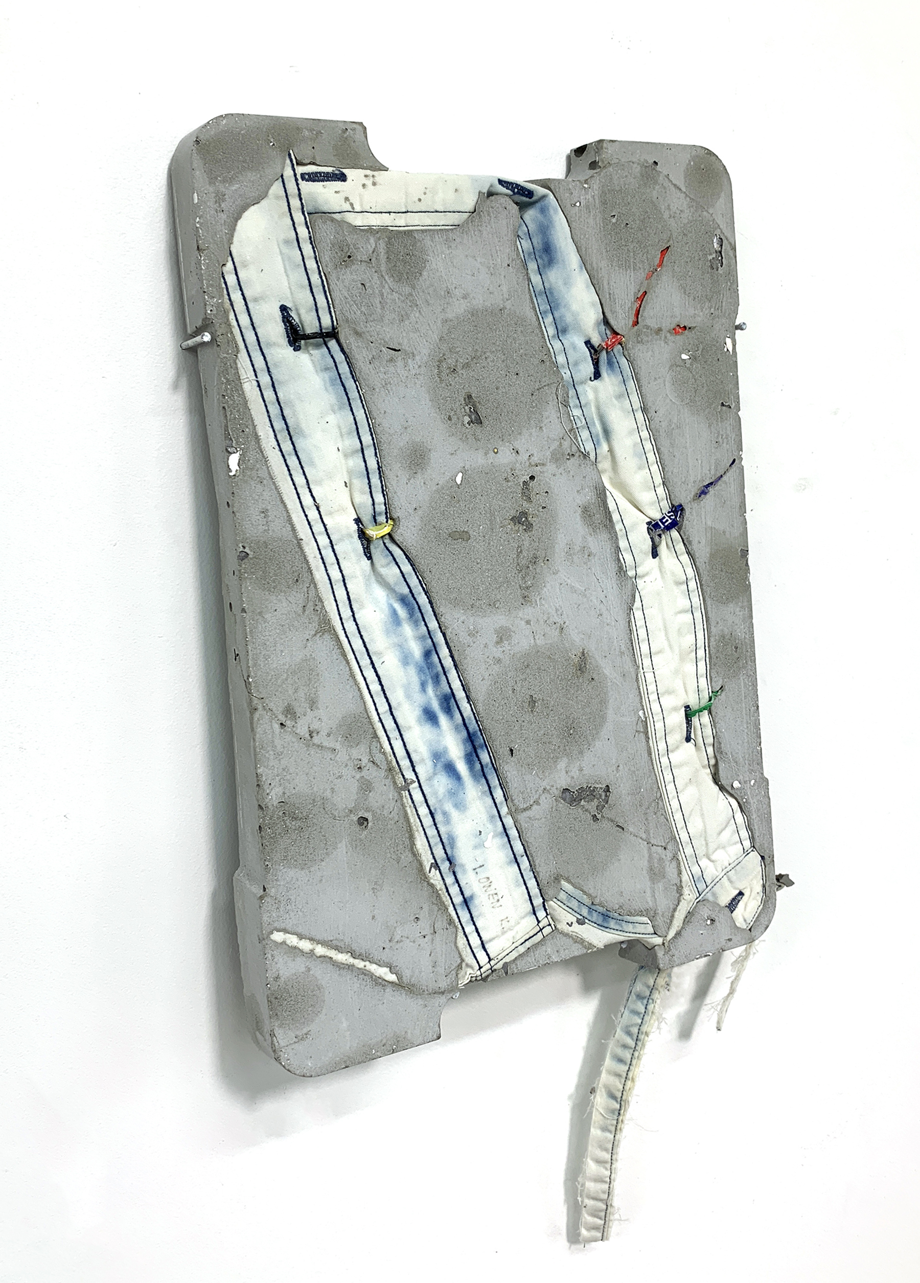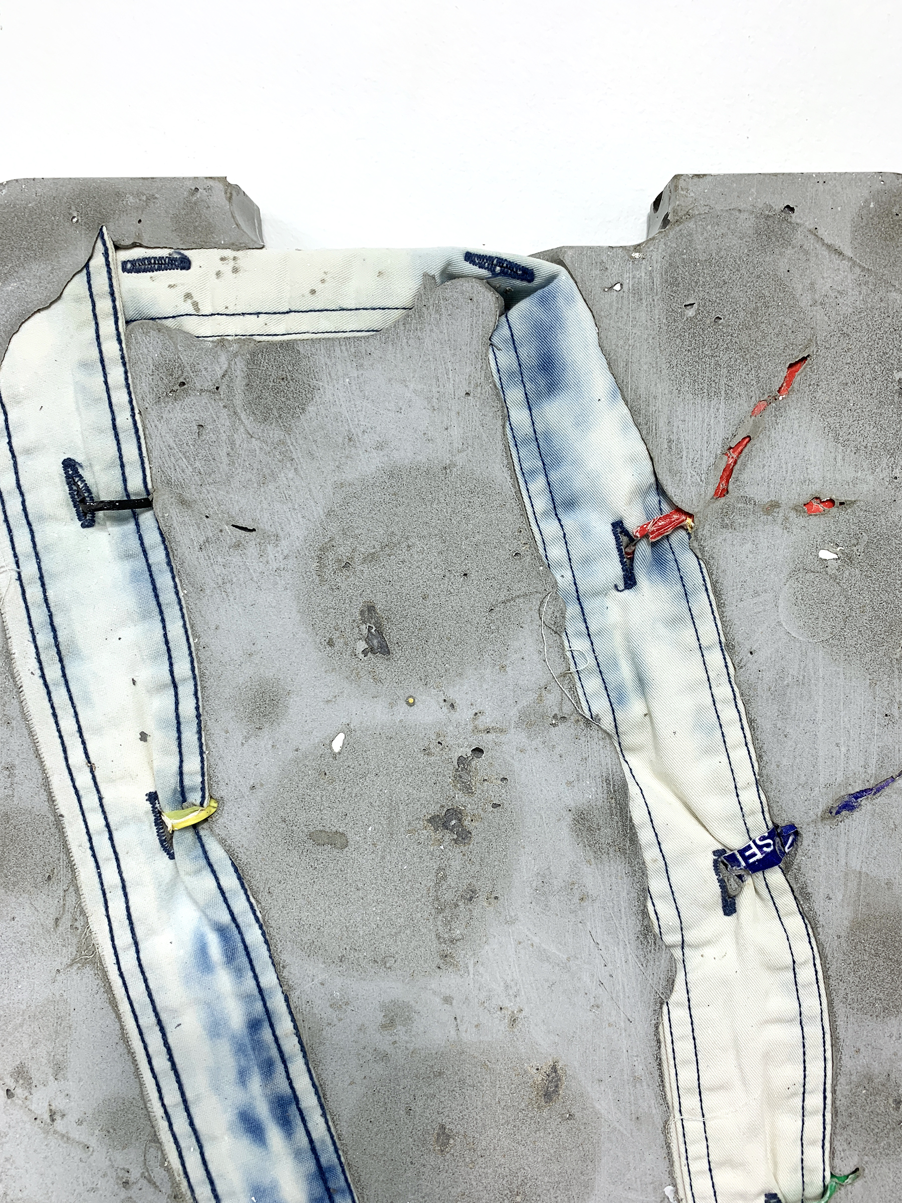 how to tie a tie (Polo to wrangler), 2020Time Tablets: our daily bread ties (for L.Owen), 2020, portland cement, shirt fragments, bread ties, 18”x14”x1.5”