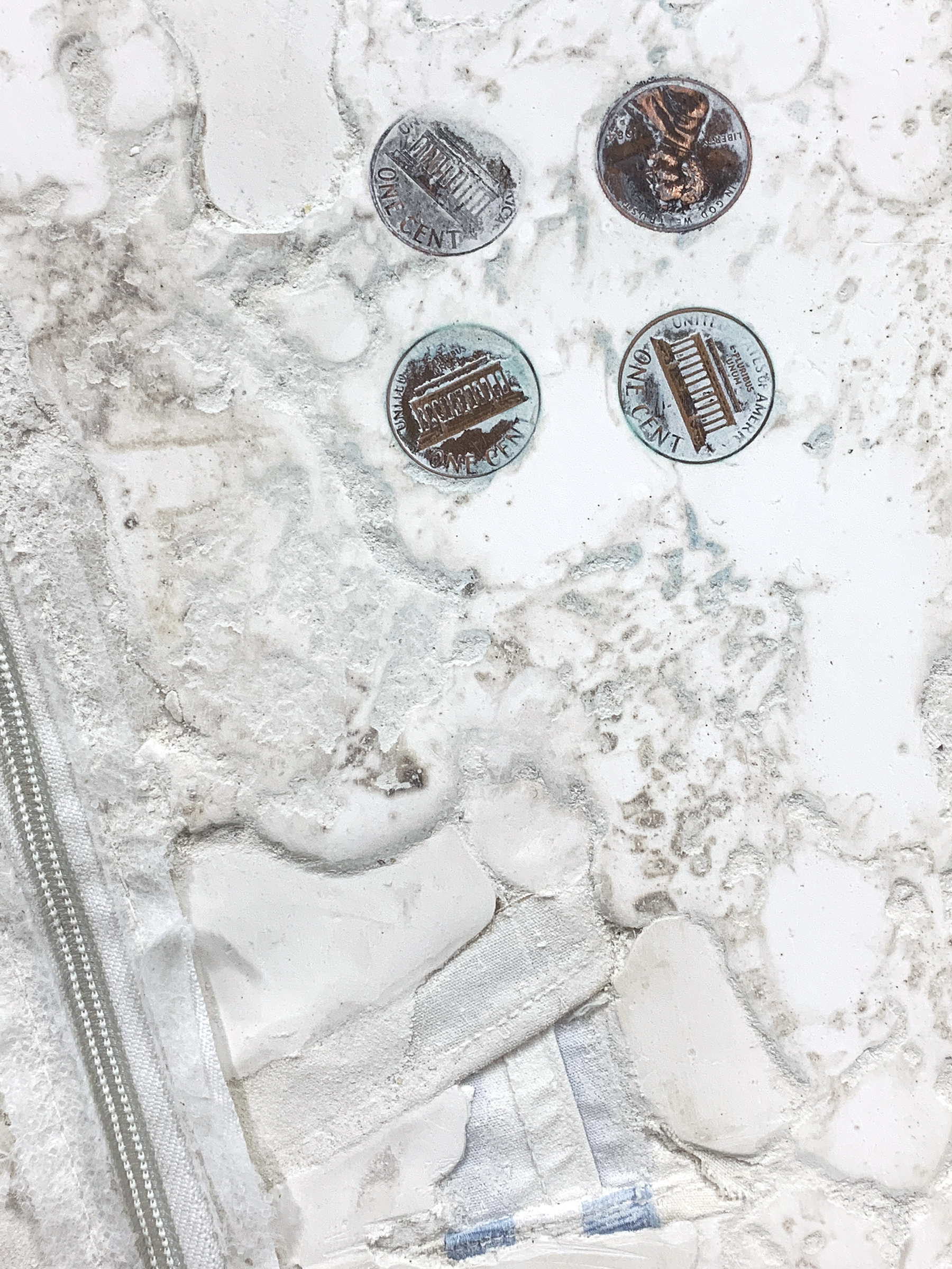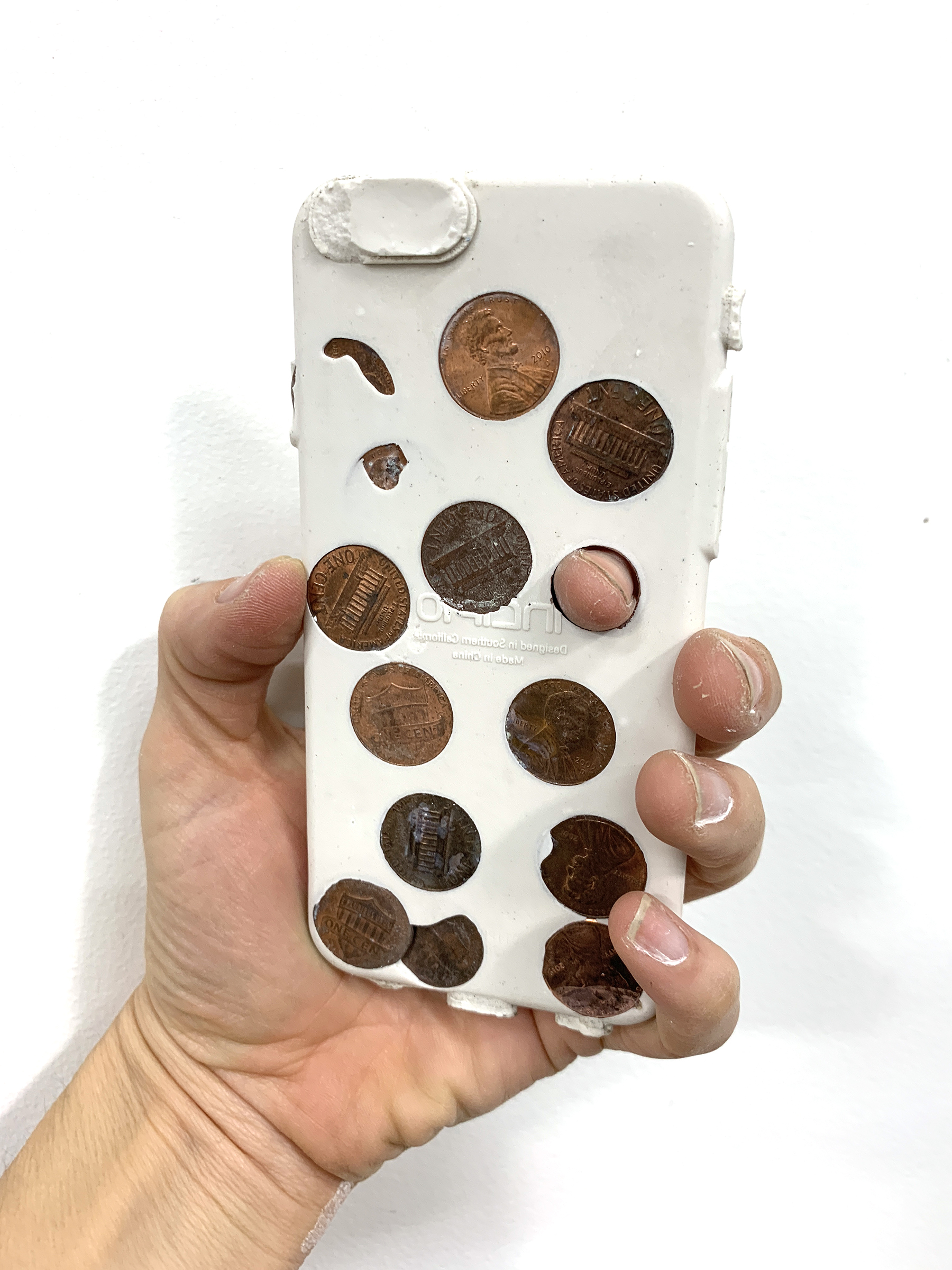 cellular memory, (pocket change prototype), 2020 Hydrocal, pennies