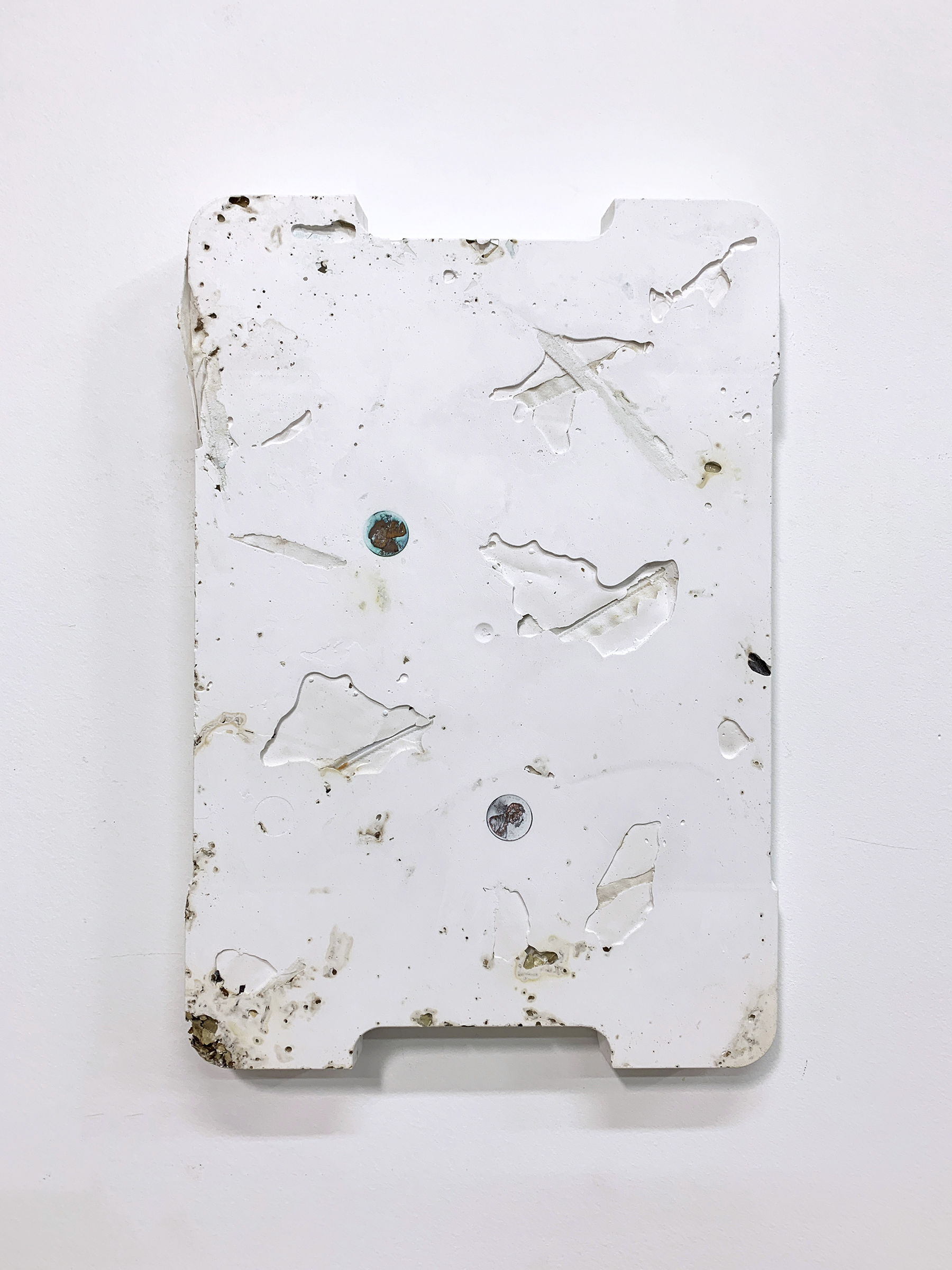 Time Tablets: kick the can can, 2020, Hydrocal, found materials, charred rainbow chard, modified copper sheet and pennies, 18”x14”x1.25”